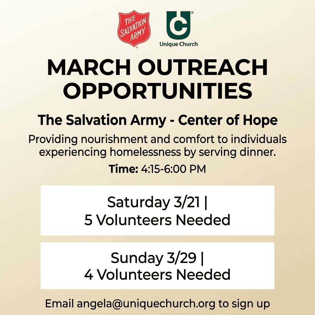 Join us as we partner with The Salvation Army – Center of Hope to serve dinner and bring comfort to individuals experiencing homelessness in our community. This is a hands-on opportunity to put our faith in action — showing up, serving well, and making a tangible difference right here in Charlotte.